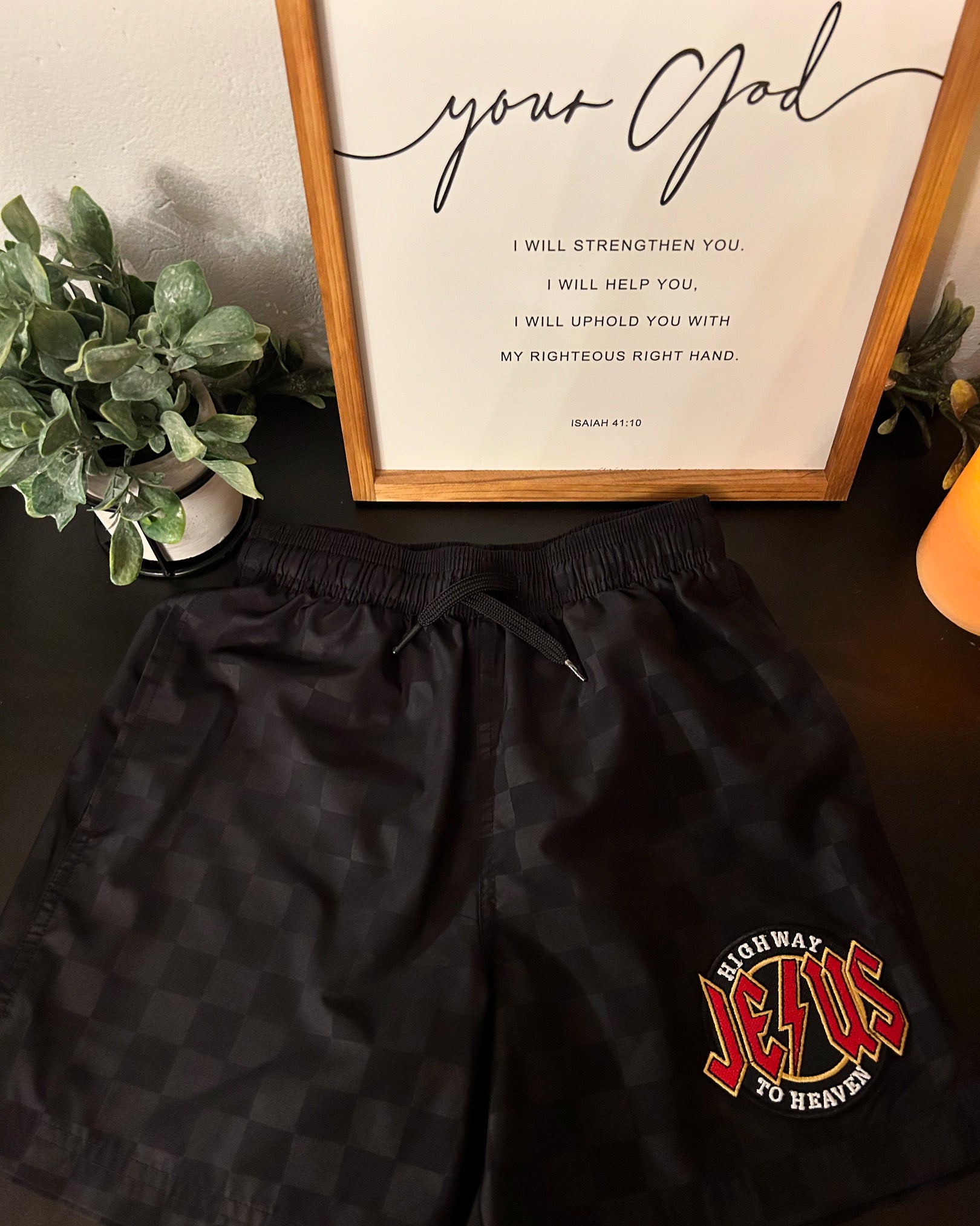 Lightly Used —Ride in faith and boldness with these one-of-a-kind up-cycled black checkered shorts, featuring a custom patch that points straight to our Lord & Savior!